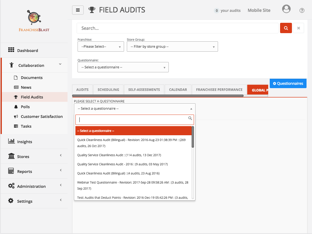 The Global Performance Dashboard is the most powerful field audit reporting tool in FranchiseBlast. The dashboard can compile thousands of audits into a single report. That said, you can only compile reports for the locations you have access to in FranchiseBlast. This means, if you’re the CEO, then you’ll have access to all locations in the franchise, and if you’re a business coach then you might only have access to the locations in your territory. If you're a franchisee, then you might only have access to the locations you own or manage.