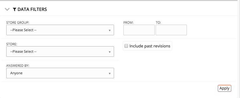 You can add filters using the Data Filters drop down menu. This allows you to filter by store, store group, auditor, date-range, ect.