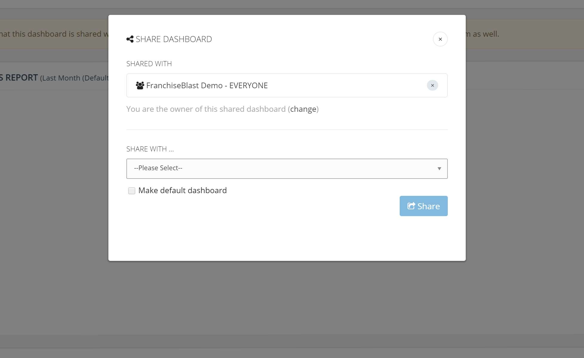 Streamline your reporting and let your organization information flow to the right people effortlessly by sharing a dashboard to a Team. A pretty common scenario is to create a franchisee dashboard and share it with all franchisees. Having a custom “coach” dashboard where they see all of their relevant franchisees is also a popular function for FranchiseBlast users.