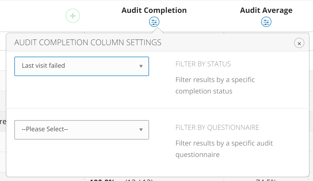 By clicking on the filtersbutton on the top of any audit completion column as shown above, you'll be able to filter the report only to show locations with a particular coaching activities status. This is useful to quickly review all locations where the last visits failed to comply to your organization's standards within a given period for instance.